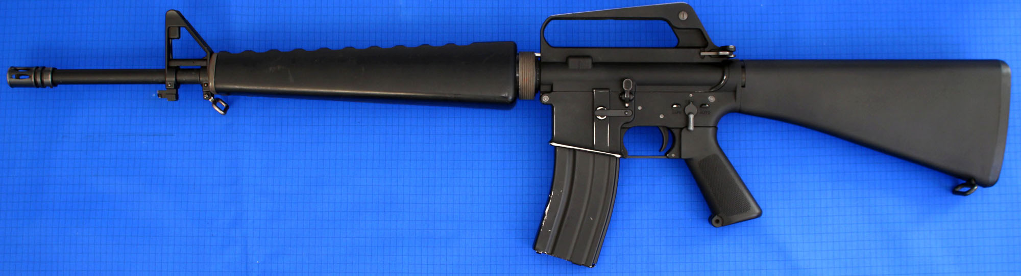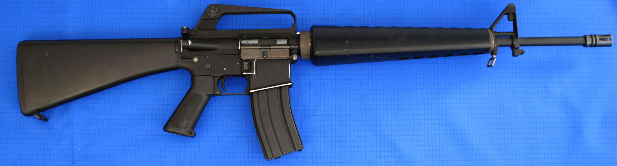 | NEW SPEC DEACTIVATED 5.56MM M16A1 RIFLE in super condition showing some sign of use to the original metal work finish, with 'undamaged' fitted plastic furniture! Comes complete with correct 20 shot box magazine, canvas sling and is deactivated with a moving charging handle (welded solid) no other moving parts. Priced. | SOLD |